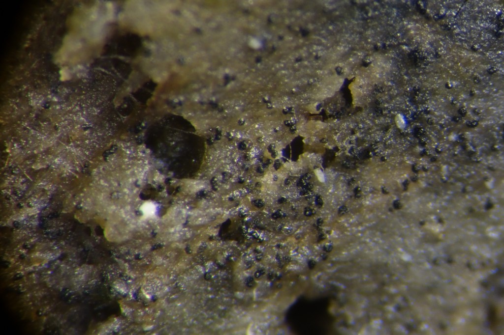 These small black bumps are the asexual reproductive structures (conidia) of Moromyces varius at 25x magnification.